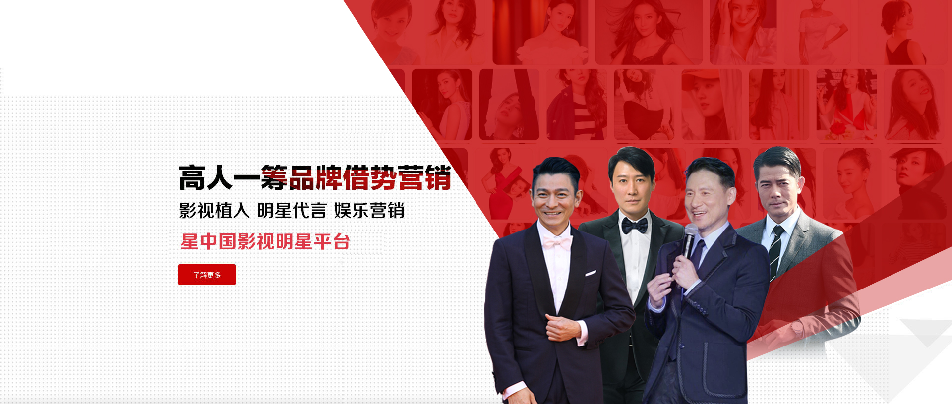 星中国多年专注于明星经纪、电影投资、综艺节目植入等影视明星娱乐营销领域。自成立以来以积极进取、勇于开拓、敢于创新的精神持续发展、不断壮大,经过多年不懈的努力在影视明星娱乐领域获得骄人的成绩并同时享誉业界及客户的一致好评!为打造核心竞争力,增强综合发展,定期组织考察、学习国际商业模式,改革制度,拟定发展方针,制定发展战略并引进高效管理模式,聘用专业管理人士、培训顶尖技术团队,为行业培养大量优秀人才!在未来的发展道路将秉承着服务为本、诚信为策、追求卓越、不断创新的经营理念,以稳健的步伐迈向先进化、品牌化、国际化的发展道路!